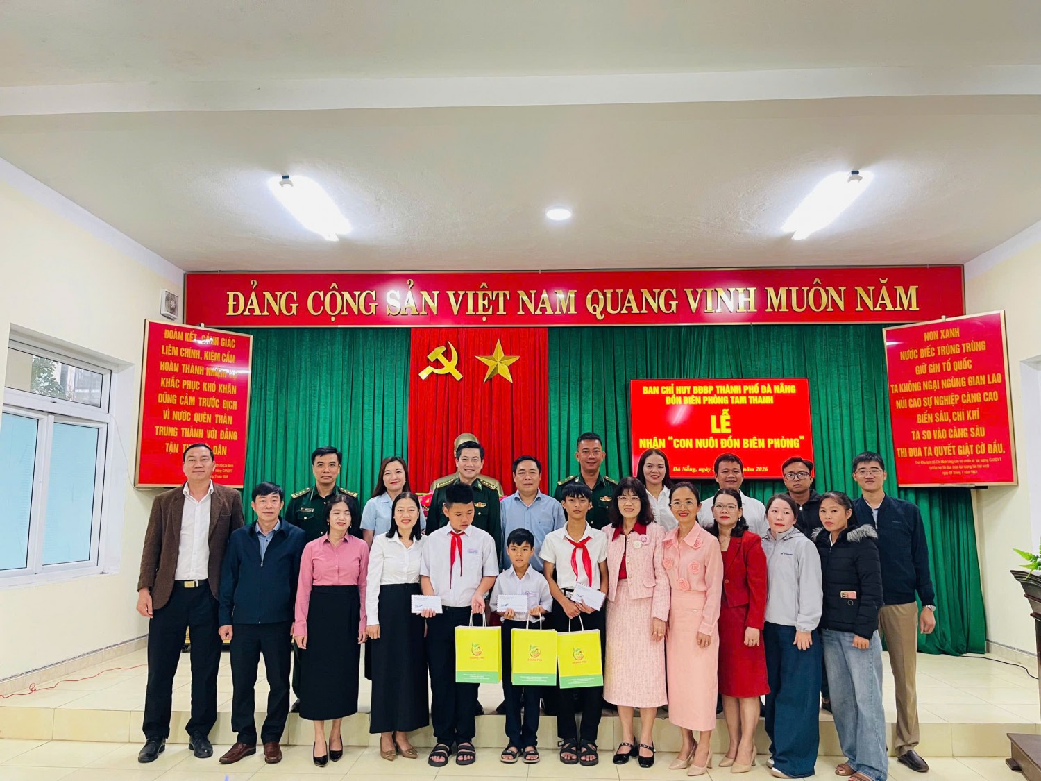 Thấu hiểu và sẻ chia với những hoàn cảnh ấy, chiều ngày 28/01/2026, Đồn Biên phòng Tam Thanh - Thành phố Đà Nẵng đã tổ chức lễ nhận “Con nuôi Biên phòng” trong không khí ấm áp, nghĩa tình đối với ba học sinh đến từ các trường THCS Phan Bá Phiến - xã Tam Xuân; trường THCS Lương Thế Vinh - xã Tam Anh và trường THCS Thái Phiên - phường Quảng Phú của Thành phố Đà Nẵng. Buổi lễ không chỉ là một hoạt động bình thường của đơn vị mà còn là minh chứng rõ nét cho tinh thần trách nhiệm, lòng nhân ái của những người lính quân hàm xanh đối với thế hệ tương lai. Tại đây, các em học sinh có hoàn cảnh đặc biệt khó khăn được đón nhận sự quan tâm, chăm sóc, hỗ trợ lâu dài cả về vật chất lẫn tinh thần, để các em có thêm điểm tựa vững chắc trên con đường học tập và trưởng thành.