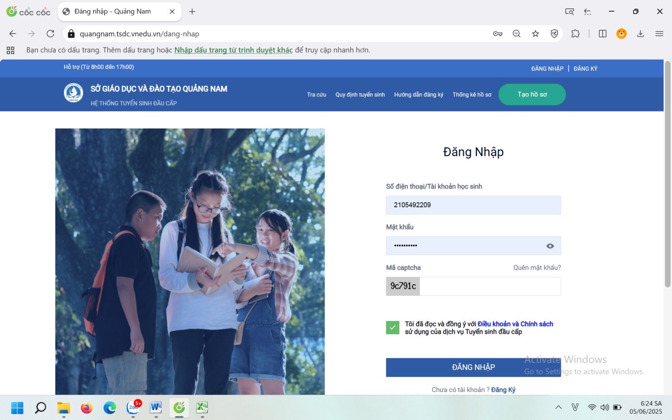 Phụ huynh truy cập trang web: https://quangnam.tsdc.vnedu.vn/ nhấn vào Đăng nhập, sau đó nhập tài khoản và mật khẩu, nhập mã captcha để đăng nhập.