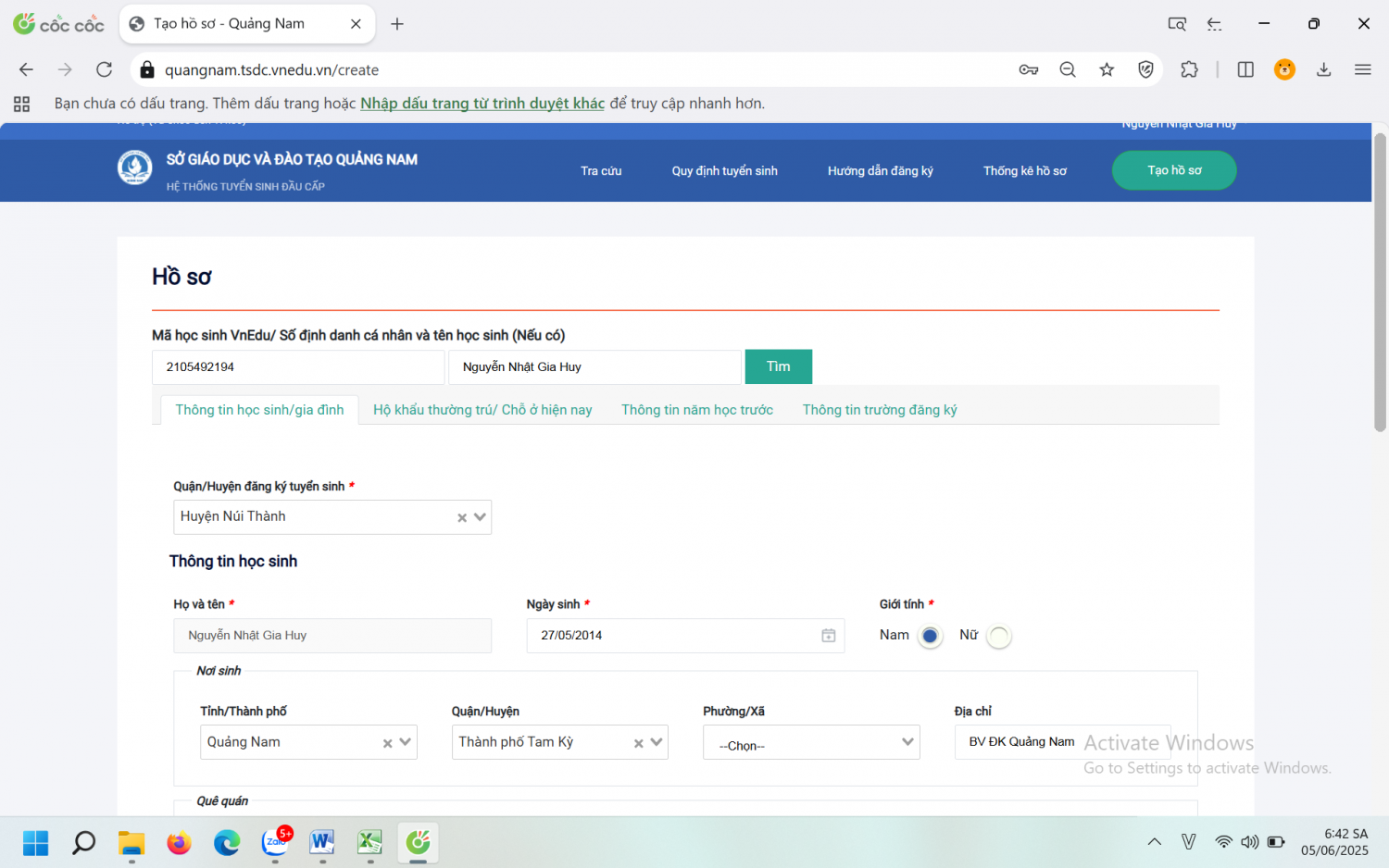 Phụ huynh kích lần lược vào các nút “Thông tin học sinh/gia đình”; Hộ khẩu thường trú/Chỗ ở hiện nay”; “Thông tin năm học trước”; “Thông tin đăng ký” để điền đầy đủ các thông tin (nhớ kéo xuống dưới, phần chưa hiển thị hết trên màn hình)