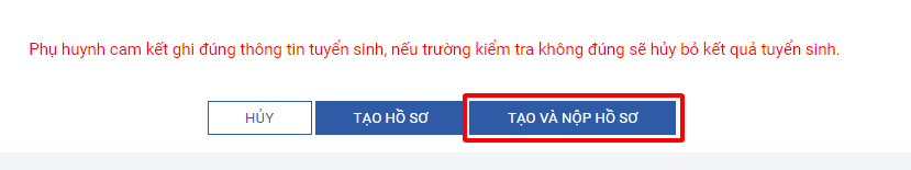Sau khi điền đầy đủ thông tinh tại bước 2, phụ huynh ấn vào nút “TẠO VÀ NỘP HỒ SƠ” (ở cuối màn hình, bên phải)