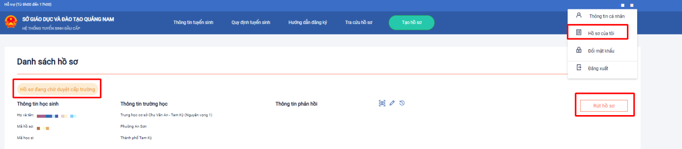 Phụ huynh đăng nhập vào trang web https://quangnam.tsdc.vnedu.vn/ Click vào tên học sinh và chọn hồ sơ của tôi để xem tất cả hồ sơ đăng ký.