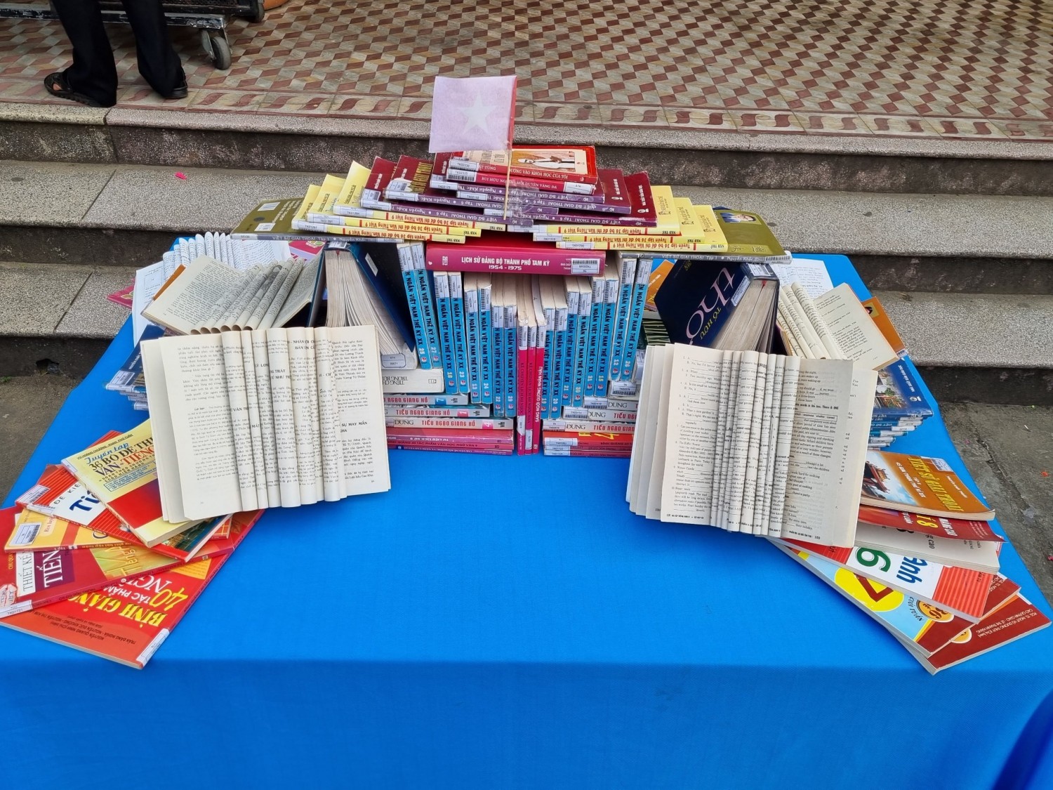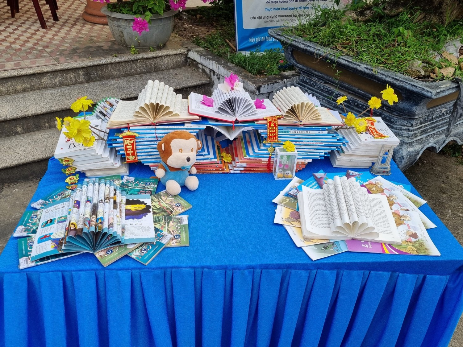 Xếp sách nghệ thuật của trường THCS Phan Bá Phiến tại “Ngày sách và văn hóa đọc Việt Nam” huyện Núi Thành